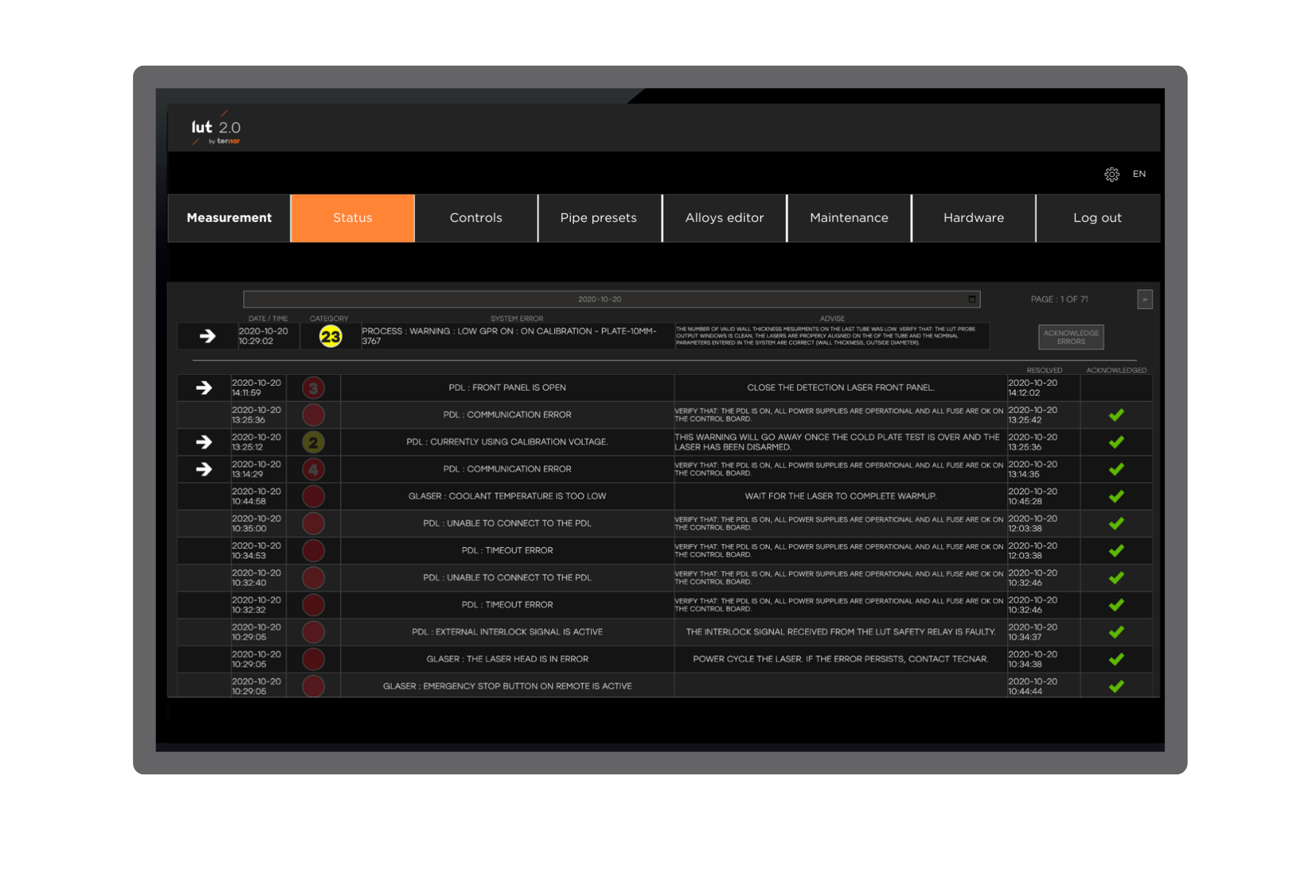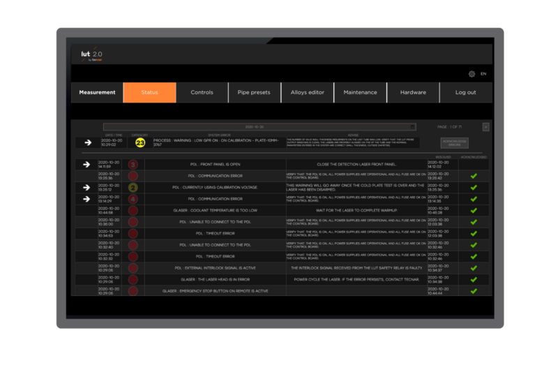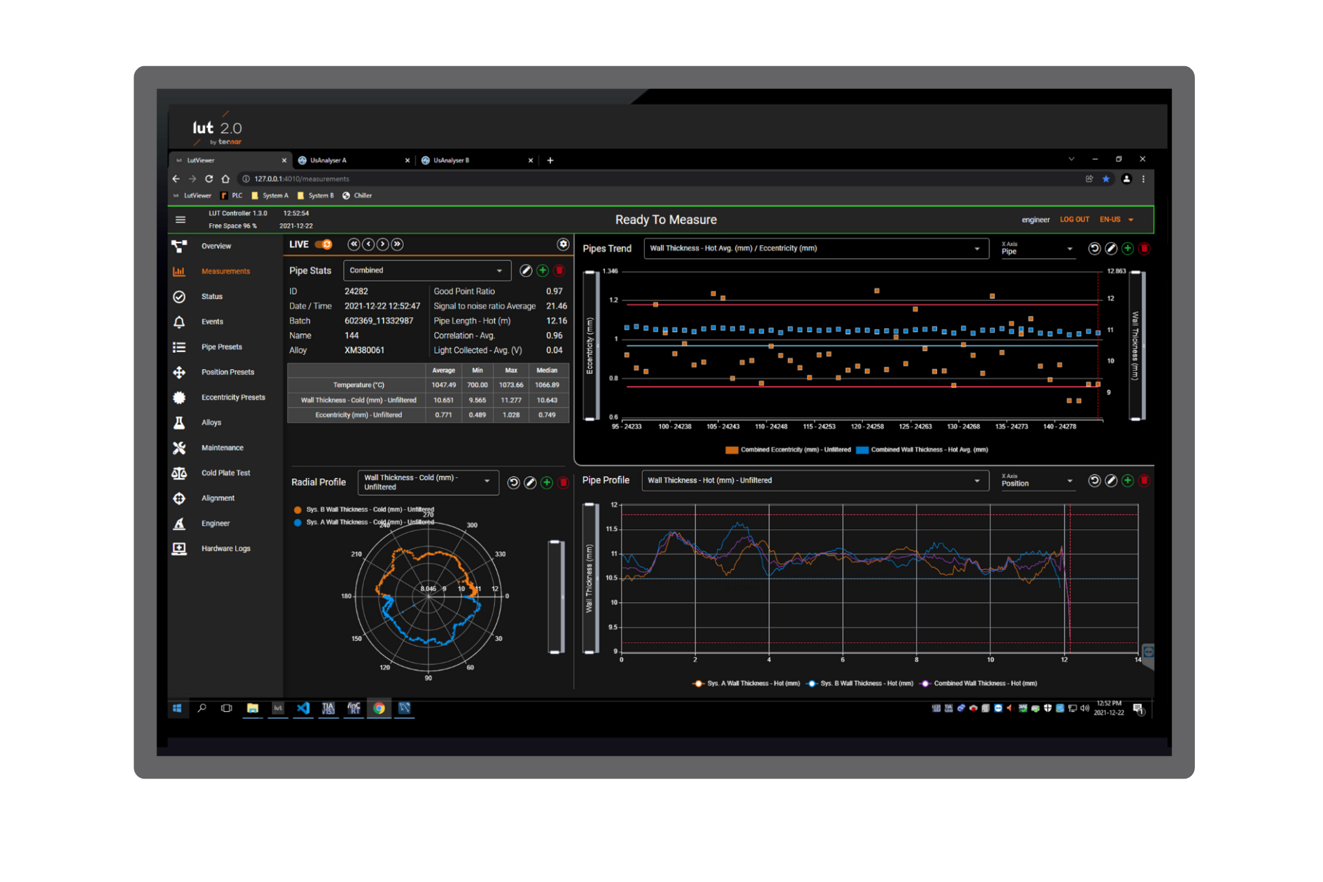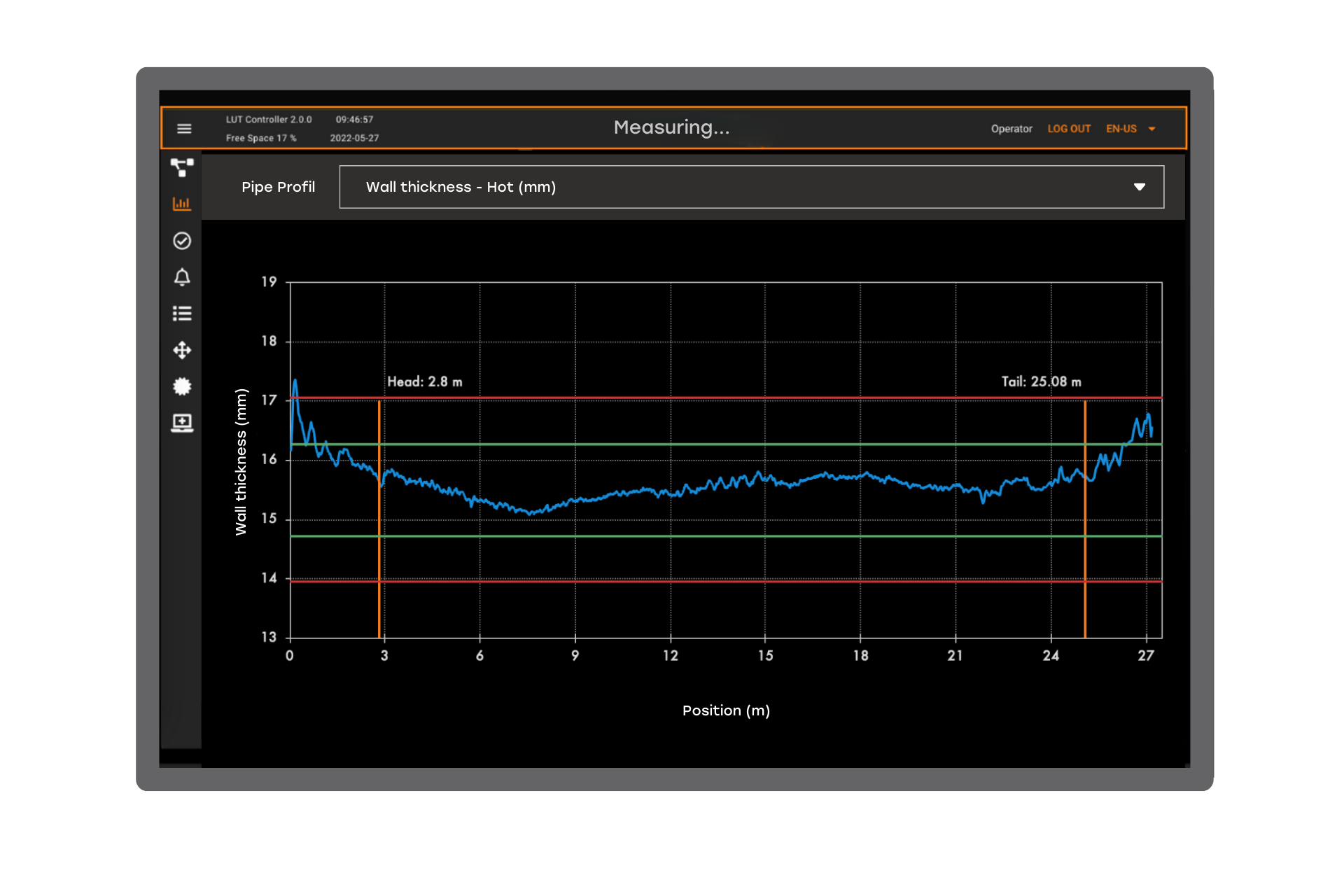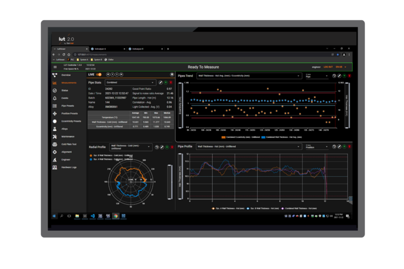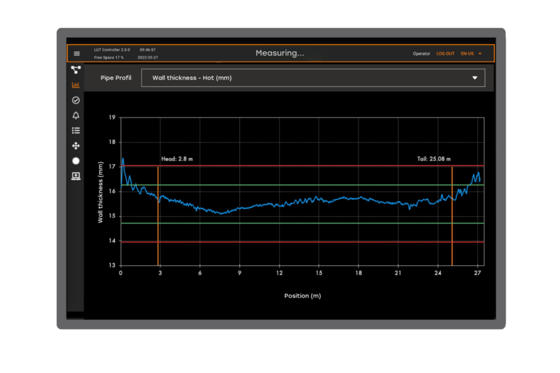 通过与工厂的自动化系统实时通信,Lut 2.0 不断监测管件的标称特性。如果 Lut 检测到偏离标准壁厚设置点,则会自动通知轧机操作员壁厚异常。