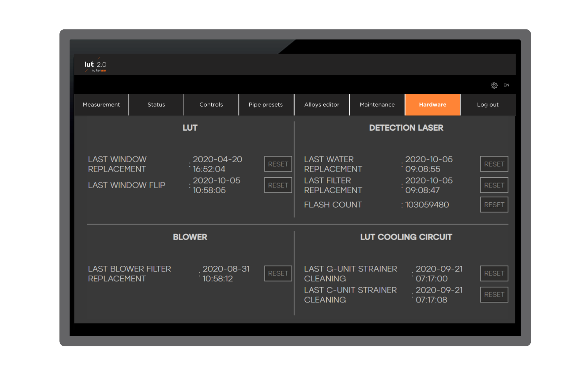 Lut 2.0 软件持续监控数百项指标,以跟踪硬件性能。如果出现任何问题,软件会立即向用户发出警报,并通过直观的软件界面引导用户完成故障排除流程,从而尽快解决问题。此外,当耗材即将达到使用寿命需要更换时,Lut 软件也会提示用户。